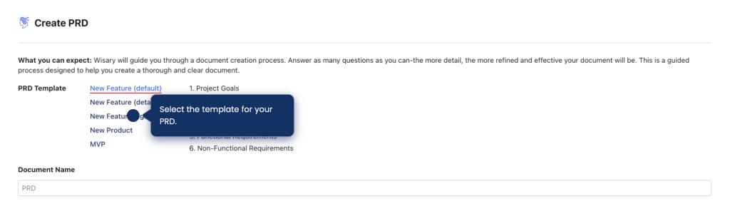 Select the document type to create between PRD, One Pager, PR FAQ, and others