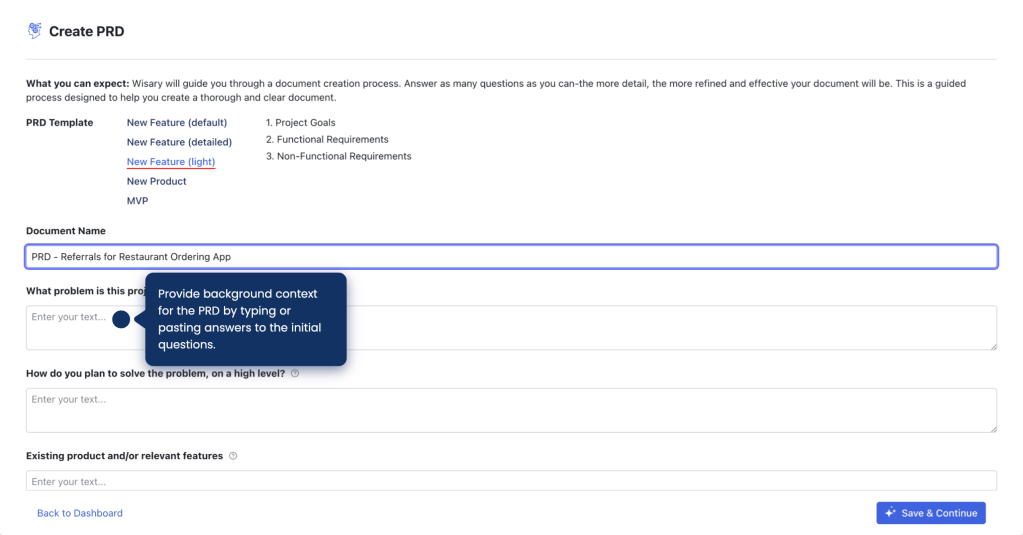Type in the document name and answer some of the initial questions to provide context for the PRD. Click Save & Continue when done.